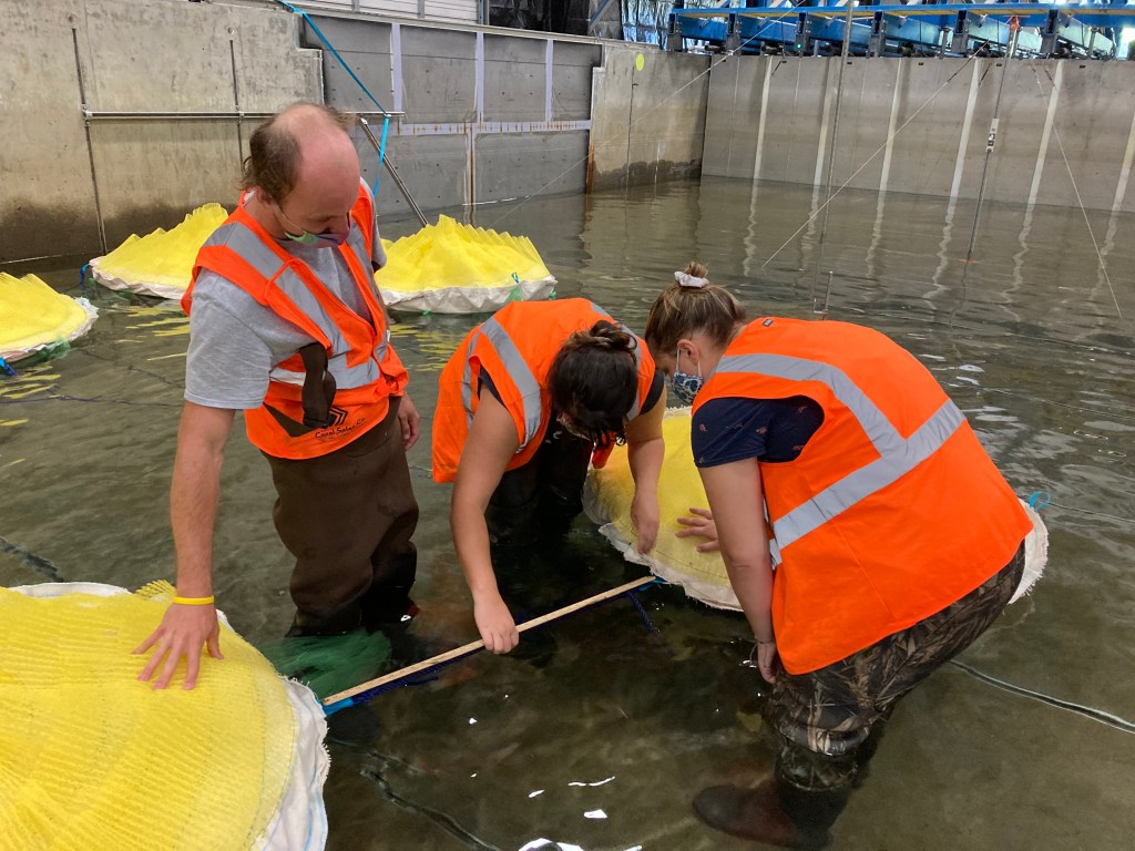 We traveled to the O.H. Hinsdale Wave Research Facility at Oregon State University in the Summer of 2021, with the goal of studying the wave attenuation efficacy of an interlinked network of floating prototypes in a controlled laboratory environment. We wanted to figure out how well the prototypes could reduce the wave energy in the coastal ocean—both at the time of initial deployment, and after marine life had colonized the unit undersides.