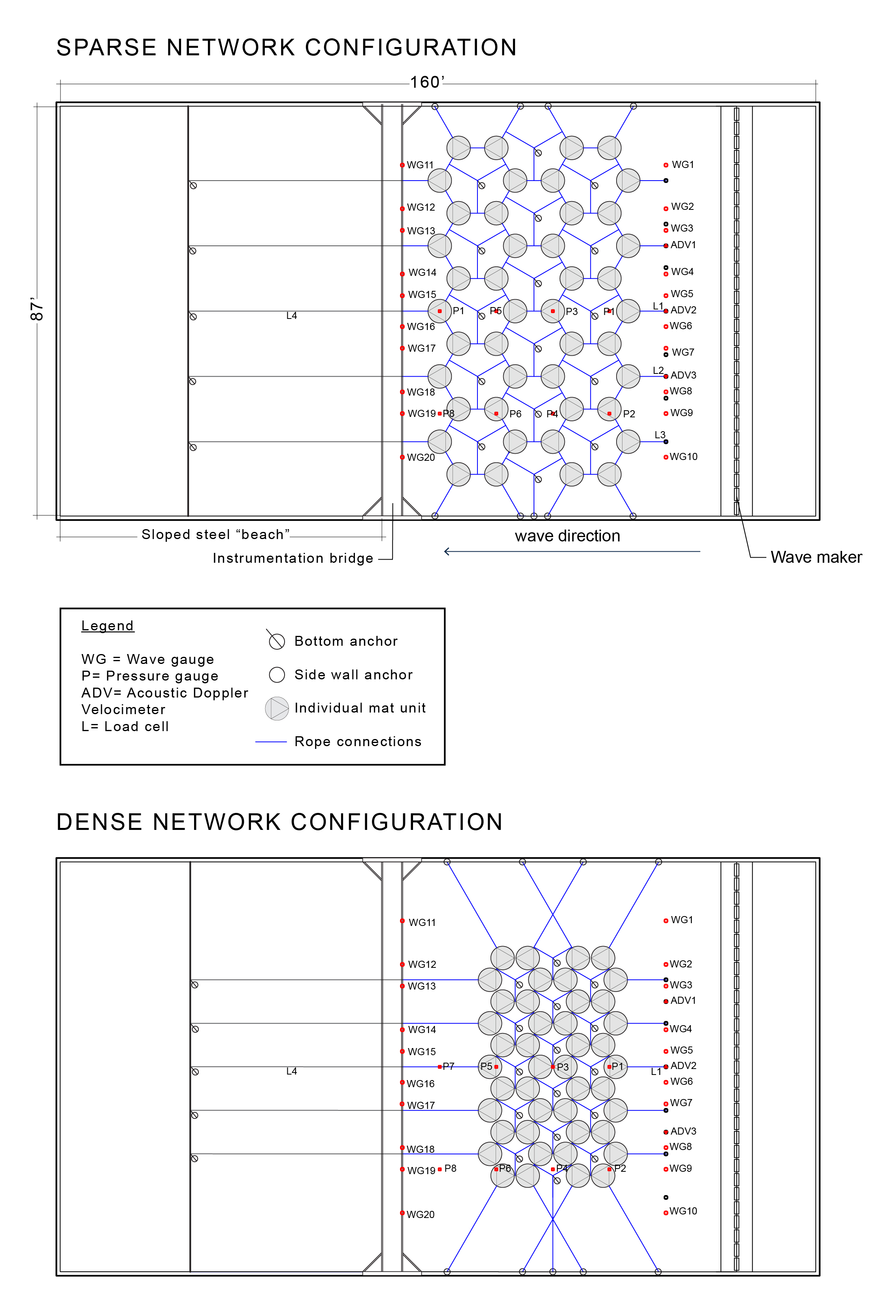 Like the tsunami pools in waterparks, the OSU directional wave basin laboratory facility is a large (160 foot long, 87 foot wide, 7 foot deep) water-filled basin that produces controlled waves of set periods and amplitudes. Instead of screaming children and tropical beverages, this wave tank facility hosts data collection systems and sensors that monitor wave height, water pressure, water velocity, tension forces, and other customizable parameters. The most relevant sensor array in our study were two sets of wave gauges, “landward” and “seaward” of our prototype network.