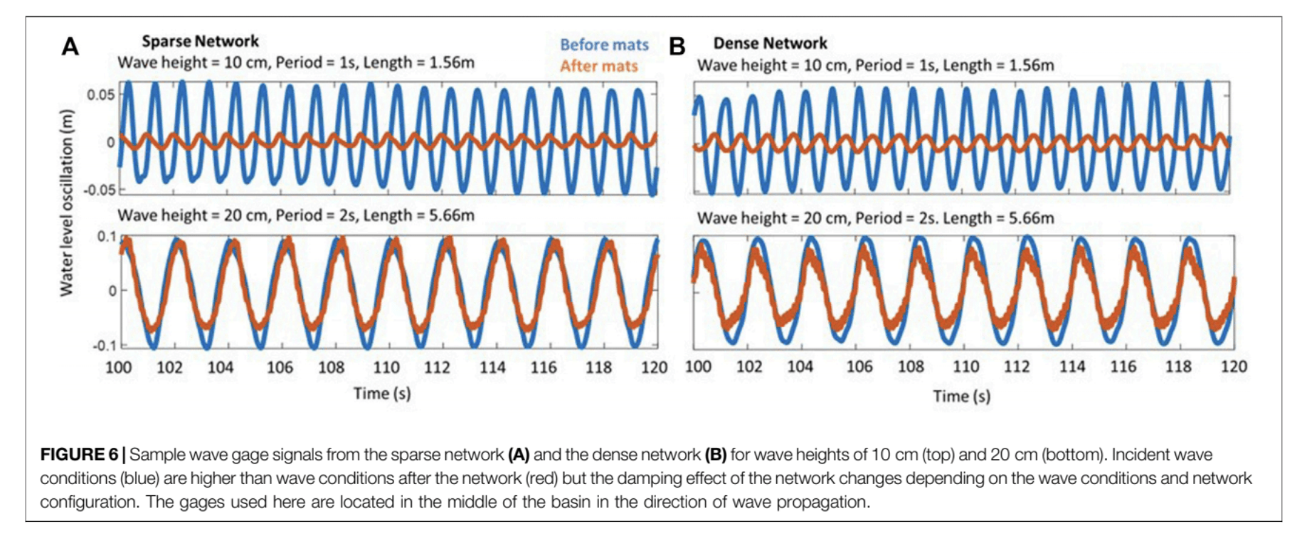 The function of the network configuration was tested but was not as sensitive to wave attenuation as it was to the incoming wavelength of the waves. Two configurations were tested: Sparse (prototypes 1 meter apart) and Dense (prototypes touching). It was found that there was not a significant difference in performance given variable spacing in the network. This finding, in addition to the results outlined in the paragraph above, lead to a hypothesis about wave reduction as a function of overall linear surface area of vegetation (in the direction parallel to wave movement).