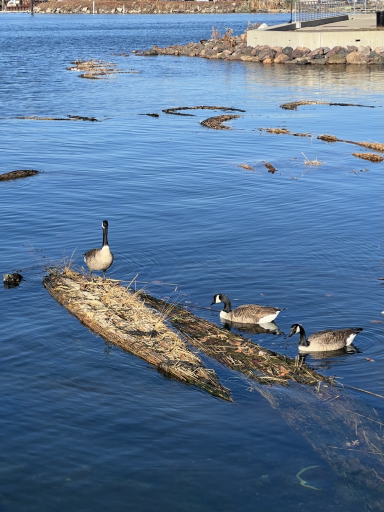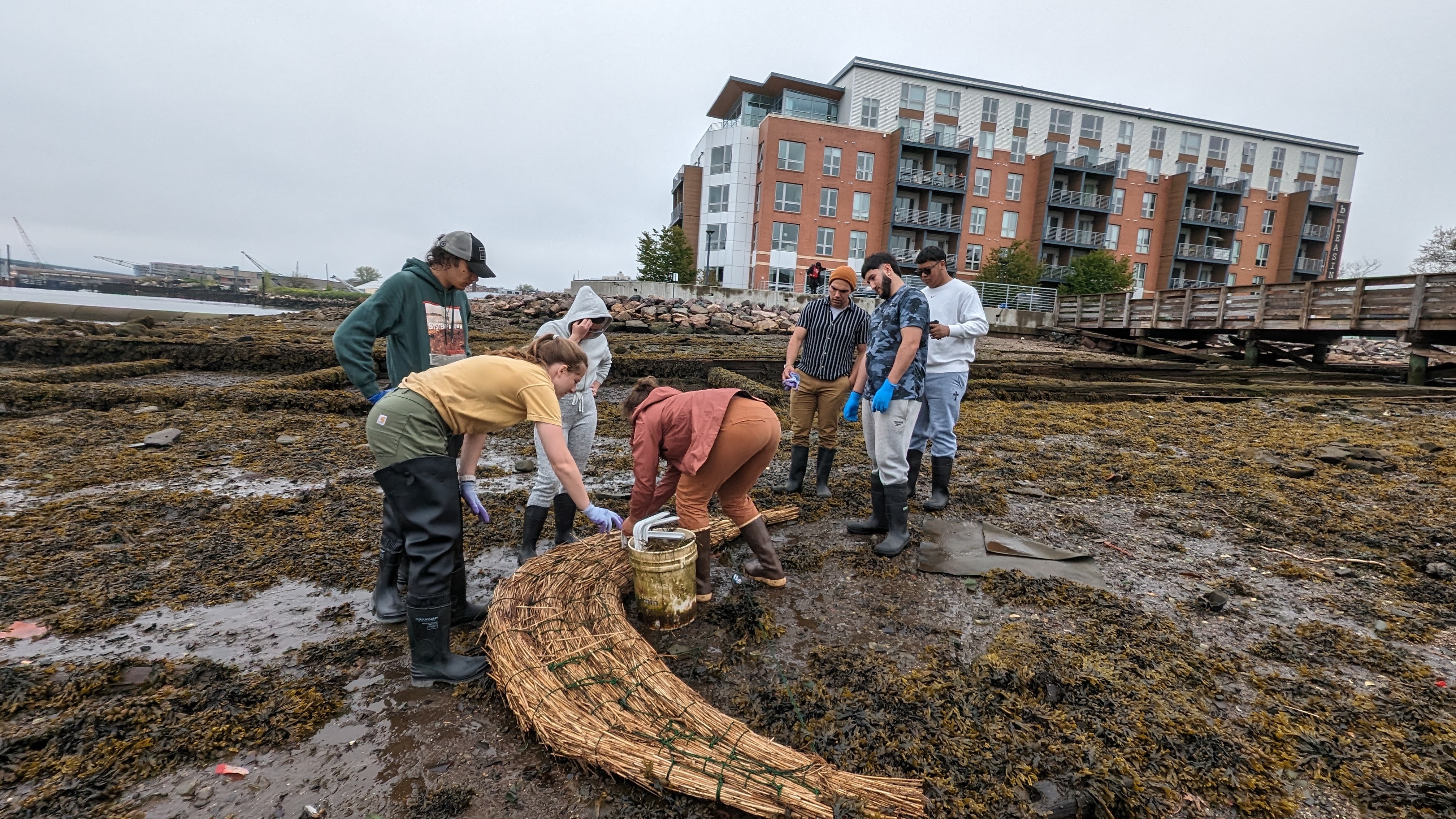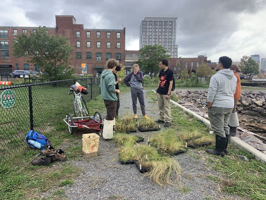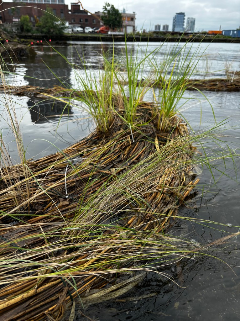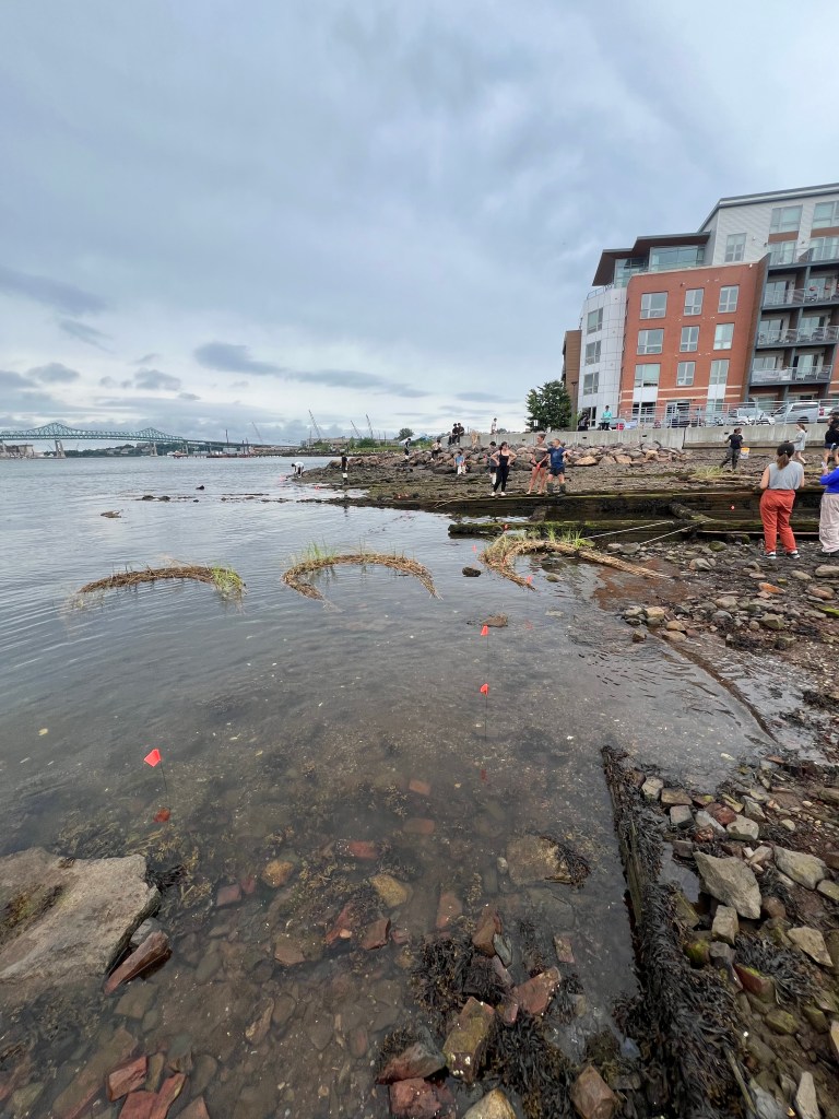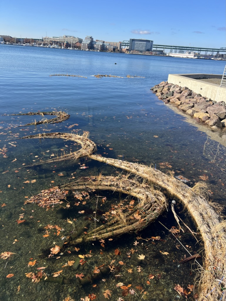 This experiment was led by scientists from Northeastern University’s Hughes Lab for Marine Biodiversity and Conservation, further building on our prototype work and expanding participation to include the Climate Corps trainees. Spartina alterniflora and Spartina patens seedlings were planted into crescent-shaped Phragmites australis living shoreline prototypes to explore the following question: How do population diversity and sourcing strategy impact plant success in a post-industrial waterfront site?