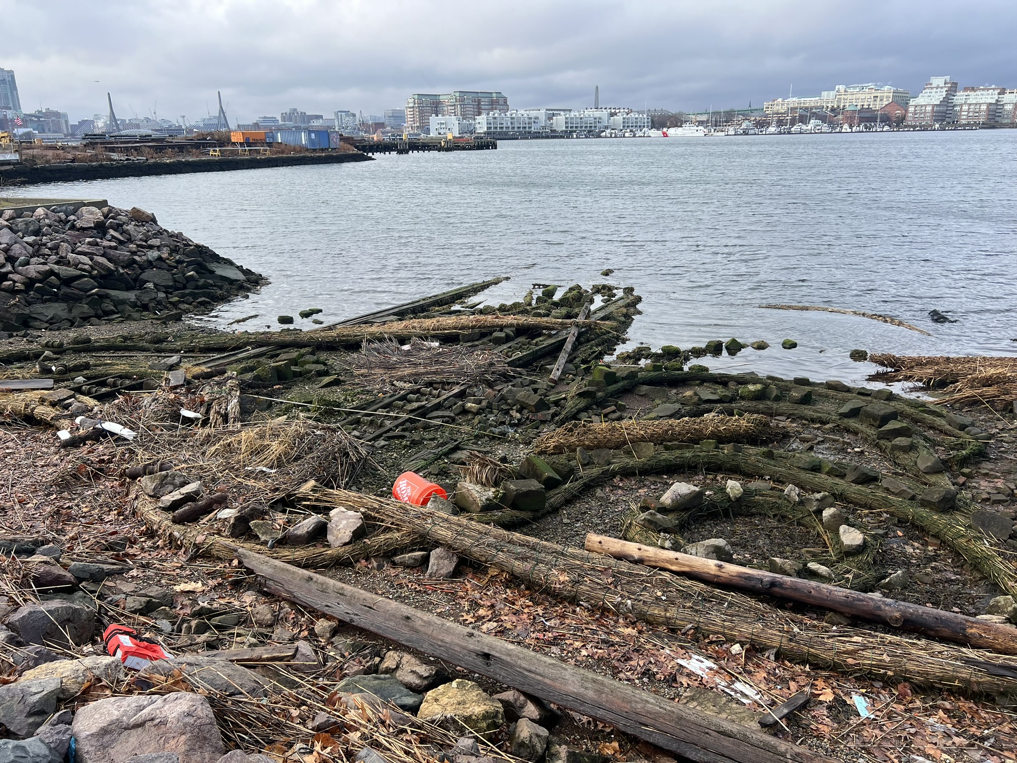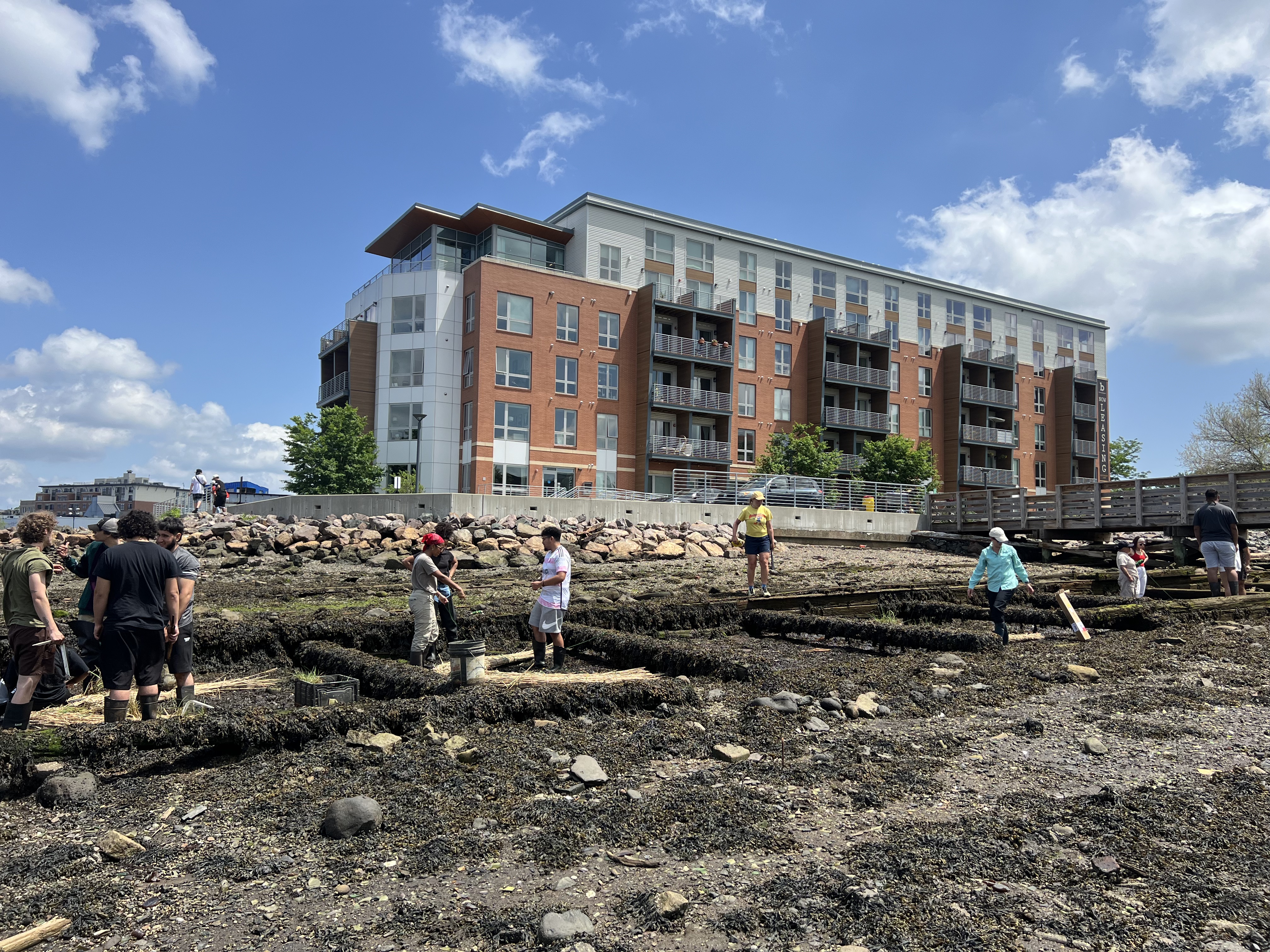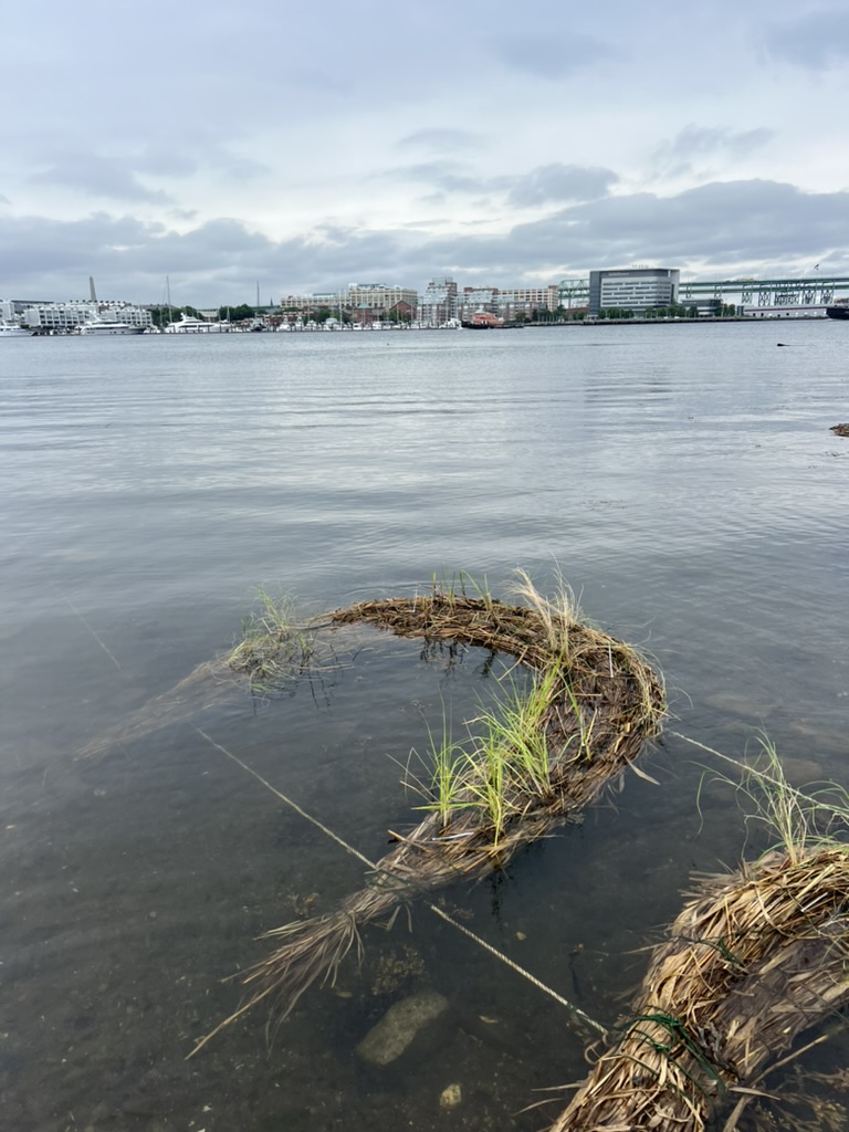 The Emerald Tutu team and the CIVIC Climate Corp Fellows built and deployed five lashed bundle living shoreline prototypes in the shape of crescents at different elevations at the Border Street Waterfront site. The prototypes were tied to the shore using rope and were originally weighed down by rocks and cast iron rollers. When Spartina plugs were planted into the living shorelines, the weights were removed to ensure the seedlings would not be crushed. This allowed the still-buoyant prototypes to float with the tide.