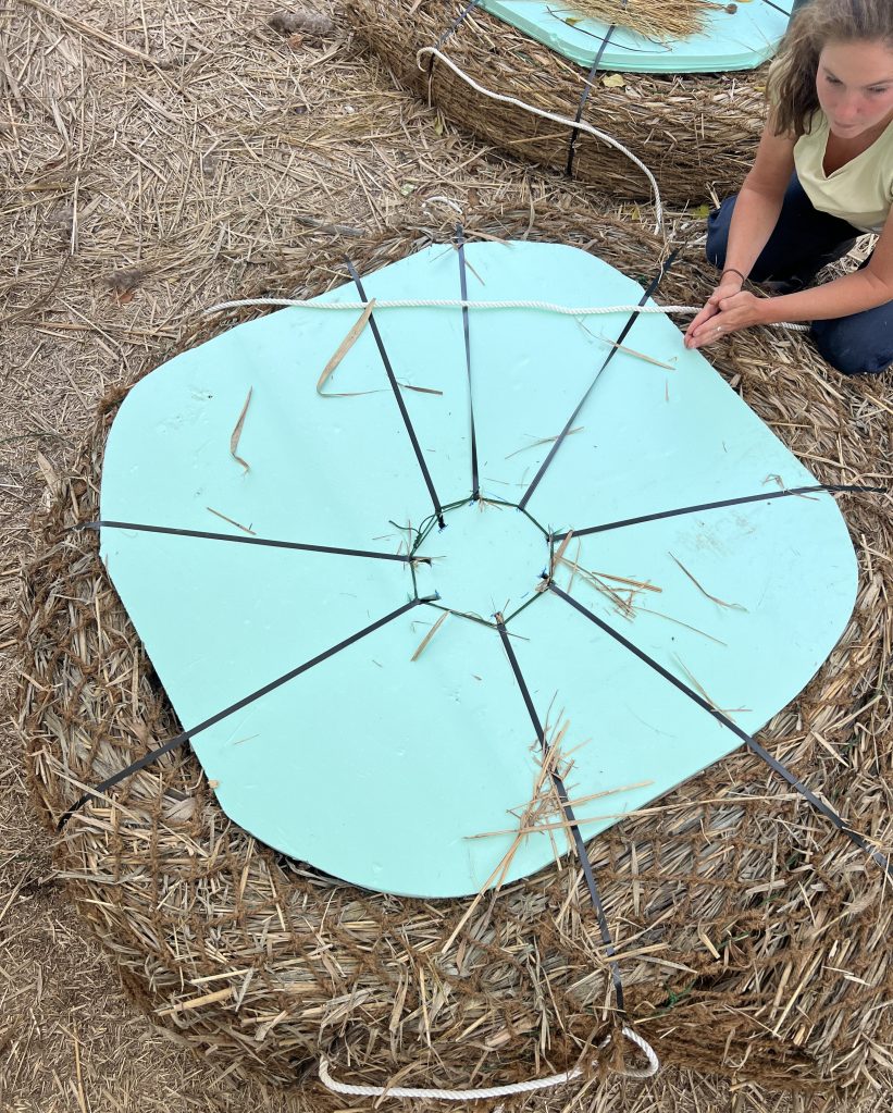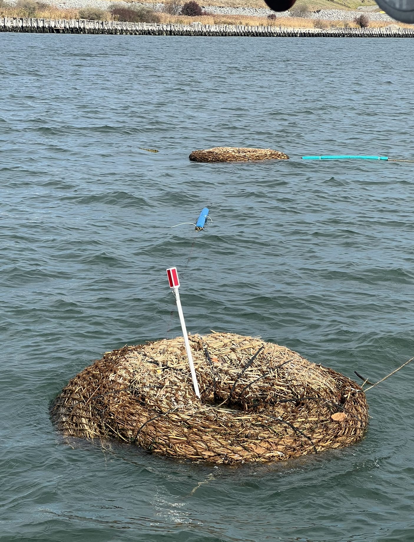These prototypes have a hole in the middle of the spiral, similar to a donut shape. This opening allowed us to create the units with late-season Phragmites that are stiffer and harder to roll tightly. These prototypes did not contain any Spartina plants; since the launch date was so late in the season (October 11th, 2025), the live marsh grass would likely not survive the winter. The three units were linked to one another with the nylon ropes of the tension yoke tied together, and were secured in place with three anchor points: standard mooring rigs with buoys and anchors.