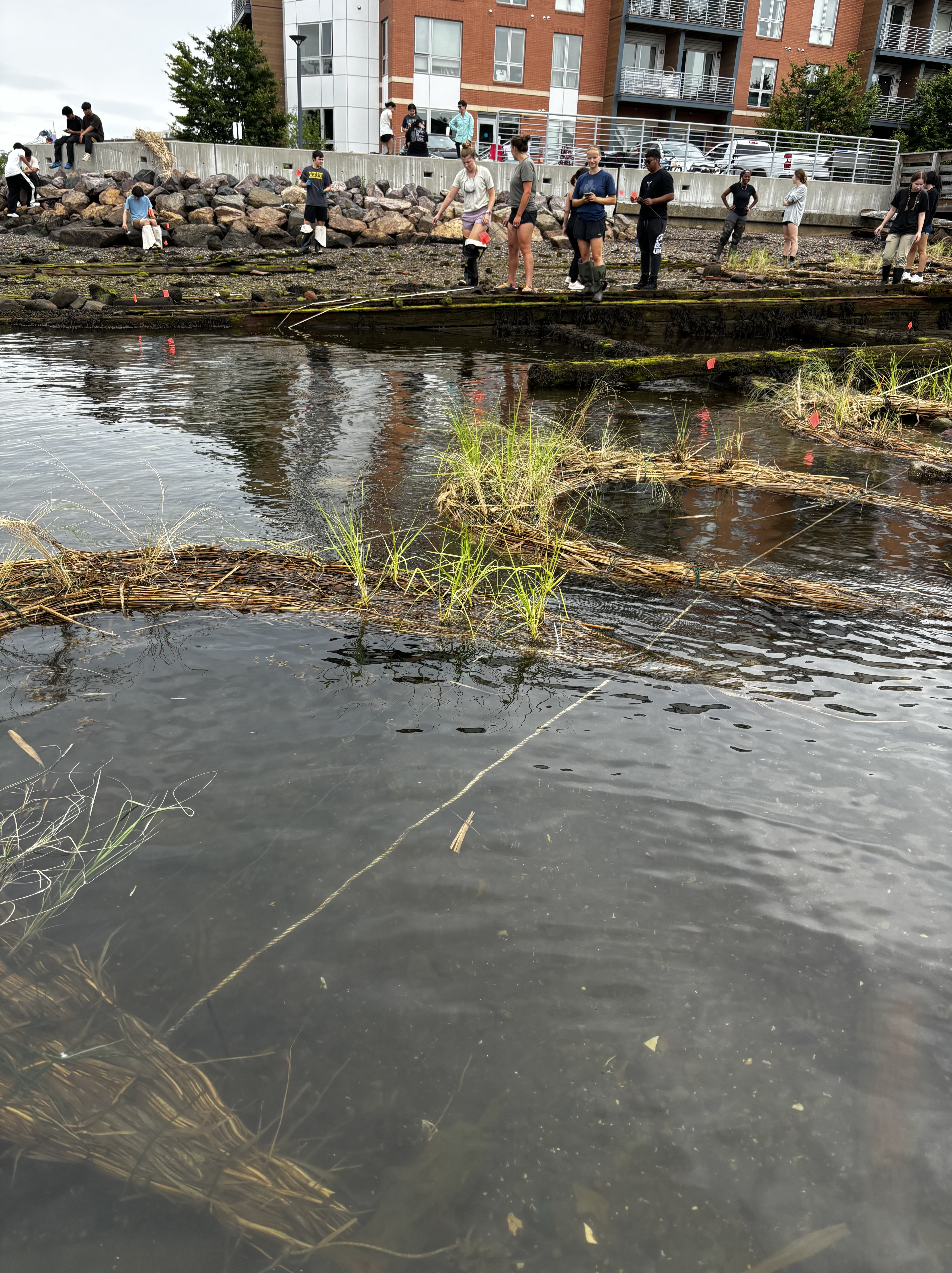Spartina alterniflora and patens seedlings planted into the Phragmites australis bundles and mats in the living shoreline prototypes at Post-industrial urban waterfront site, Border Street, East Boston, MA