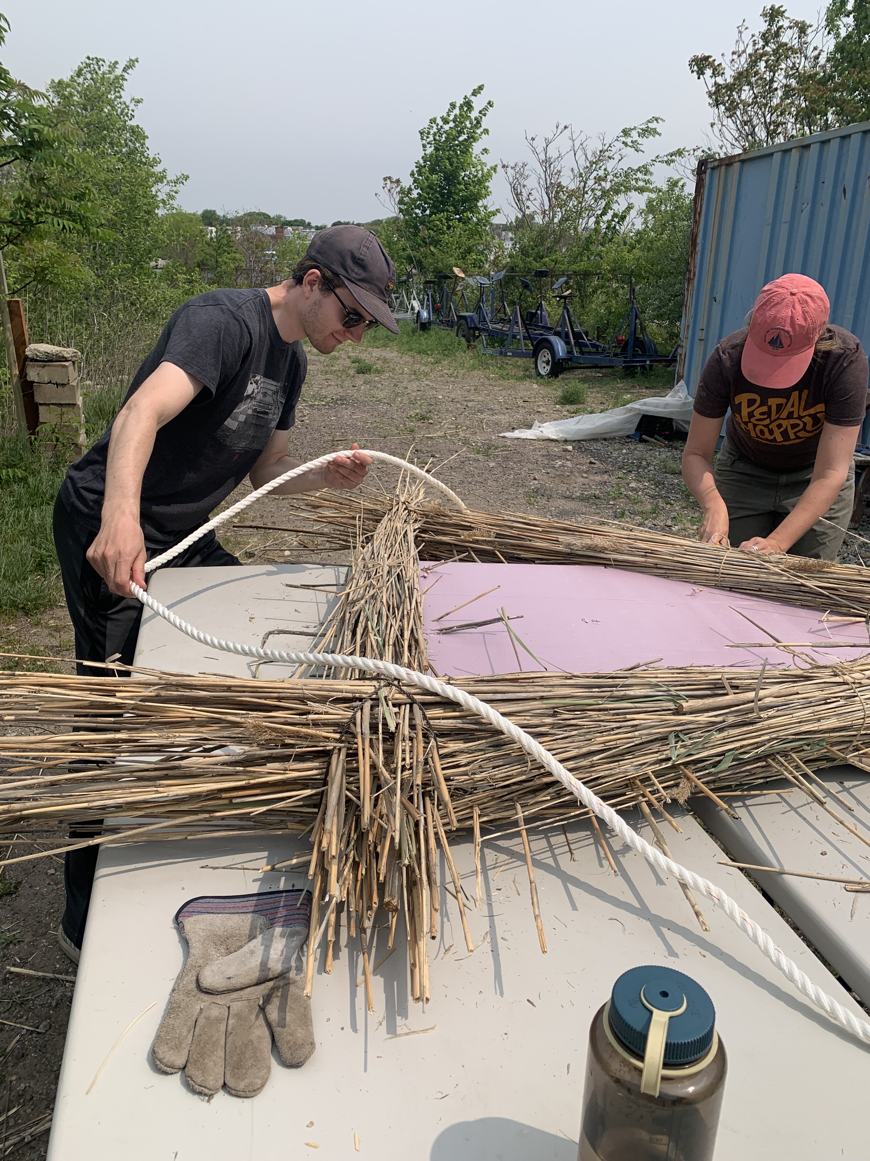For each layer, small bundles of dead Phragmites reeds are laid side-to-side (“weft”) and are woven together with thin nylon string (“warp”). The resulting mat is flexible in the warp direction, and rigid in the weft direction, similar to “matchstick” rolling window blinds or a sushi mat. This method is straightforward and quick to assemble, requiring no special tools.
