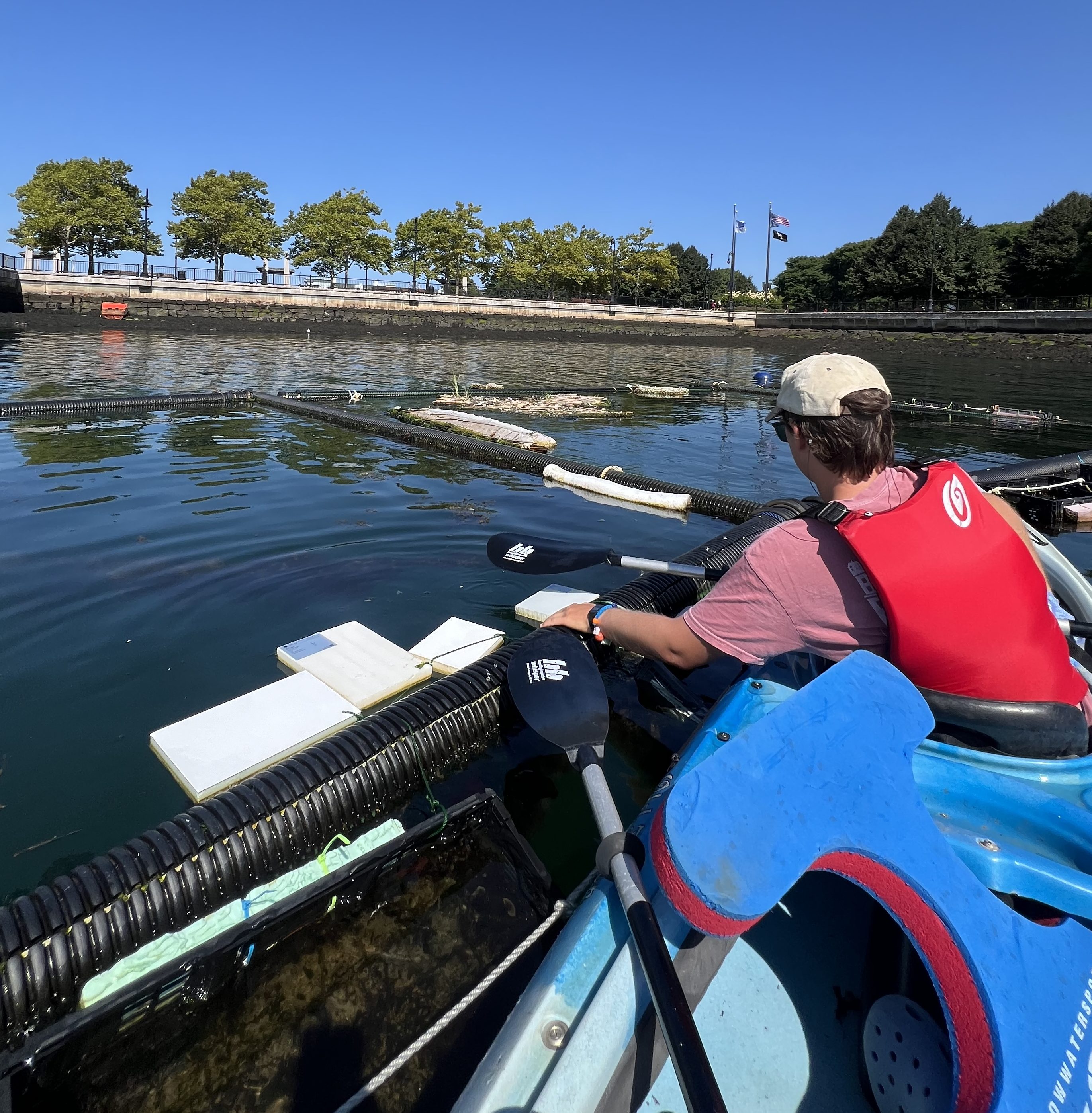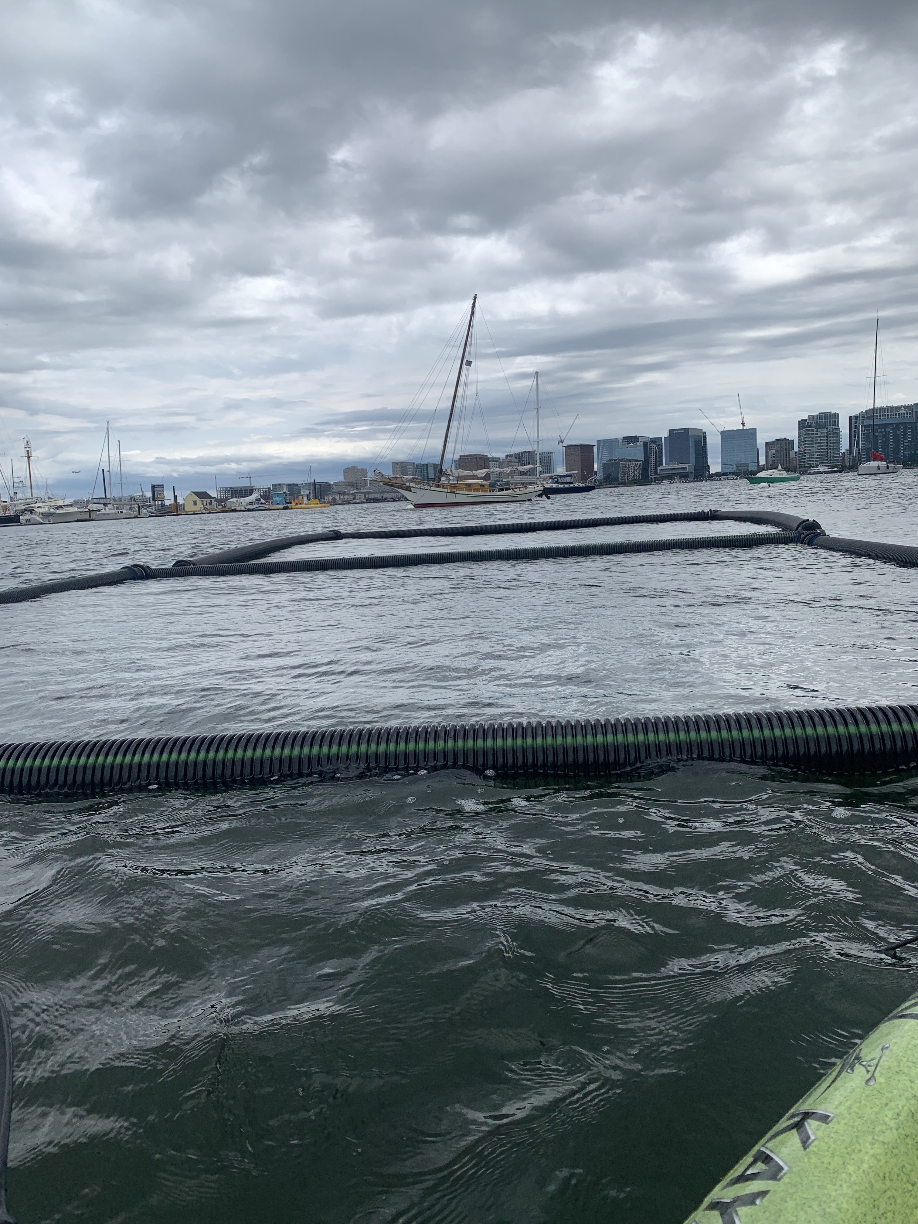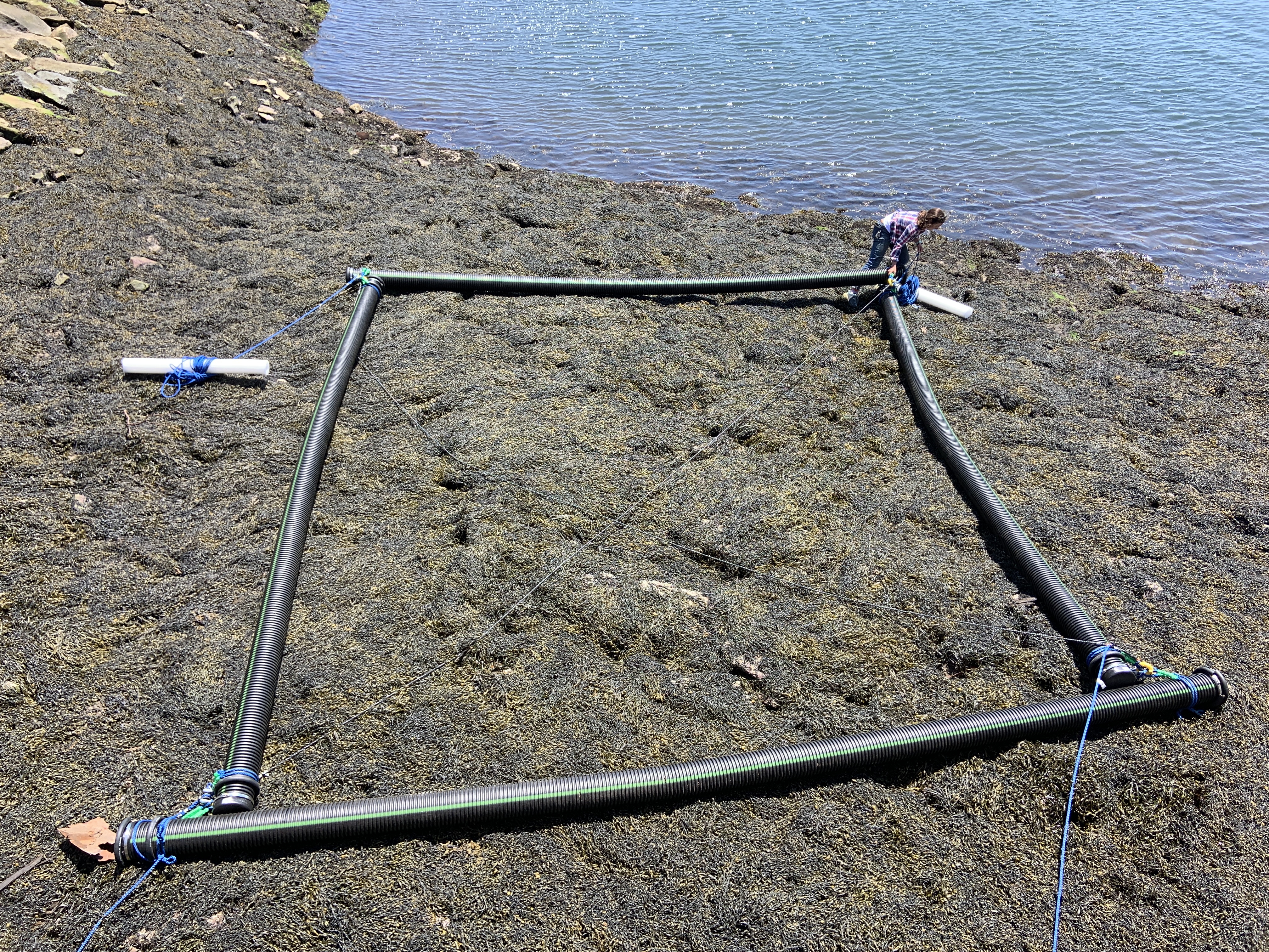 The Floating Frame is located 200 feet off the Southeast corner of Piers Park, tucked between Piers Park and Boston Shipyard and Marina, with about 20-30 feet of water depth. The frame is exposed to ship wake and low to moderate wave energy of Boston’s inner harbor. The frame itself is constructed of linear corrugated high-density polyethylene (HDPE) tubing that allows rope to be affixed at any point along an edge.