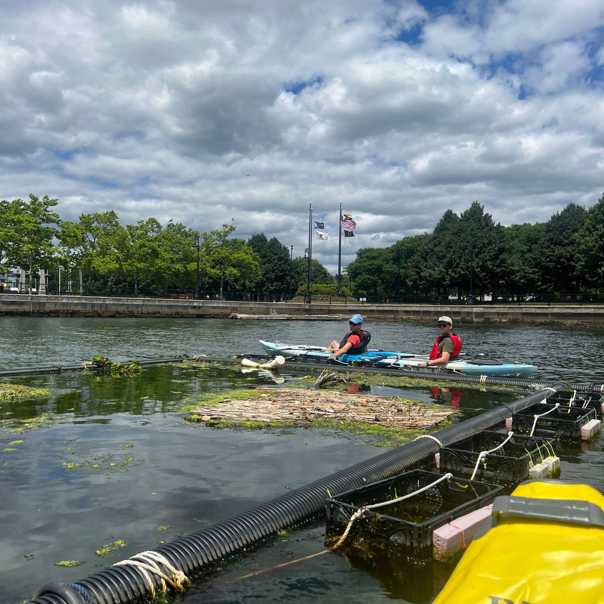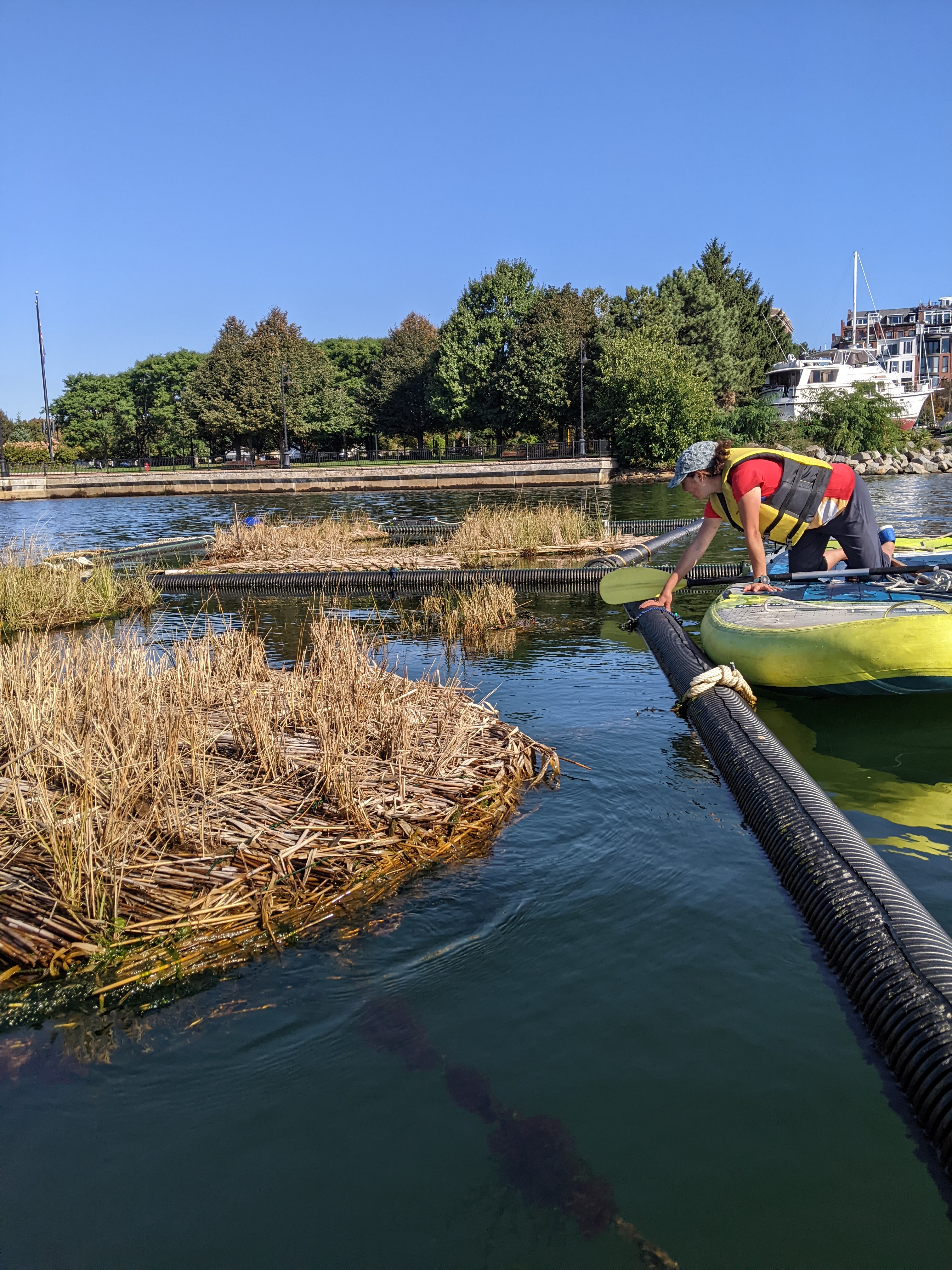 The Floating Frame is visible from shore at Piers Park in East Boston. It allowed for lots of experimentation with our prototype design, as we could quickly launch new prototypes there using only kayaks. The frame can hold up to a dozen prototypes, eliminating the challenge of individual anchors or buoys for each prototype, and making it much easier to routinely monitor them. Prototypes were positioned within the frame and affixed to it with nylon rope. Additional floating elements were attached to the outer perimeter to conduct smaller experiments that focused on Spartina seed immersion growing and buoyancy foam alternatives.