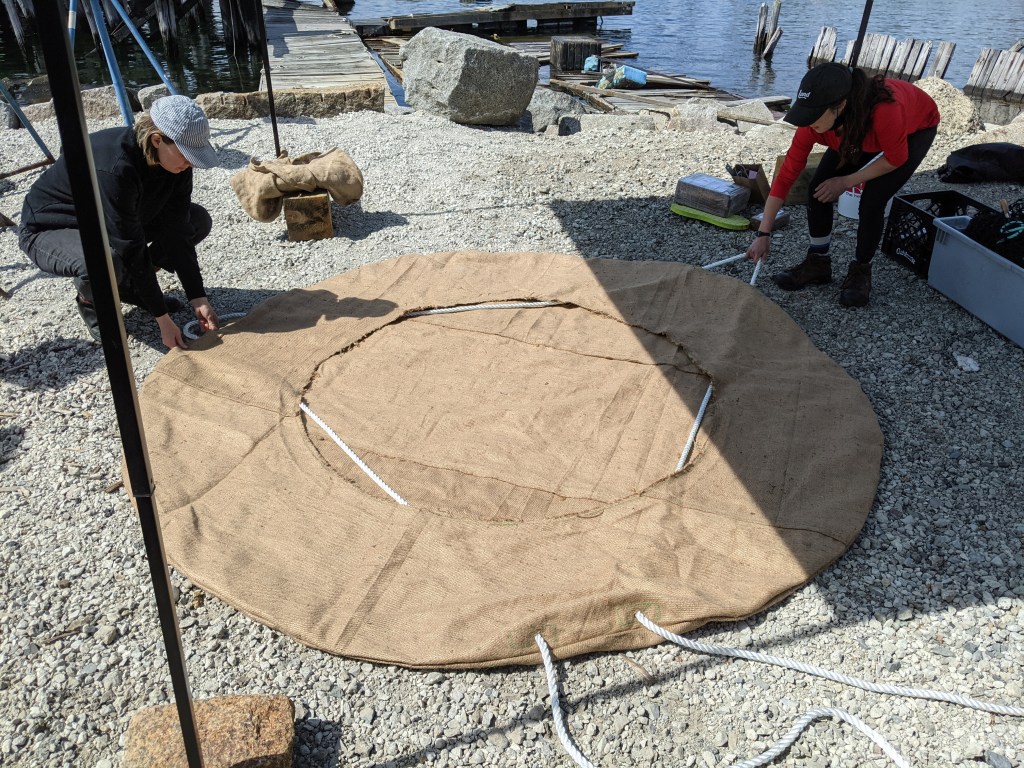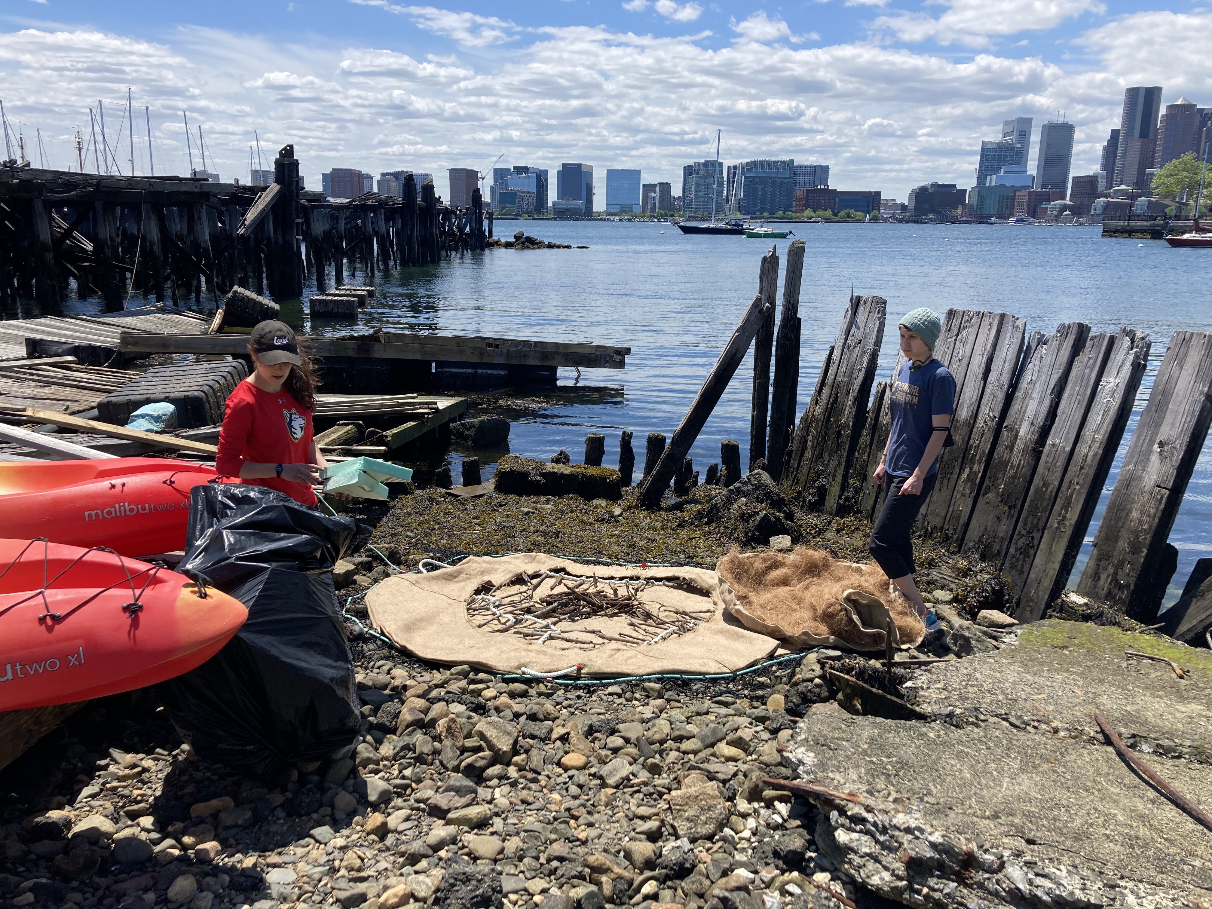 With sewing needles, burlap, polystyrene foam, and a truckload of wood chips, we began building a massive mat of biomass below the high tide line on a rocky shore amidst abandoned piers in East Boston.