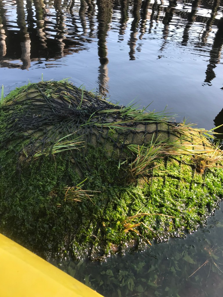 - Only 6 weeks after installation, in mid July, we observed significant growth of the planted marsh grass seedlings and substantial colonization by aquatic organisms on the very first of the Pouch Net prototypes.