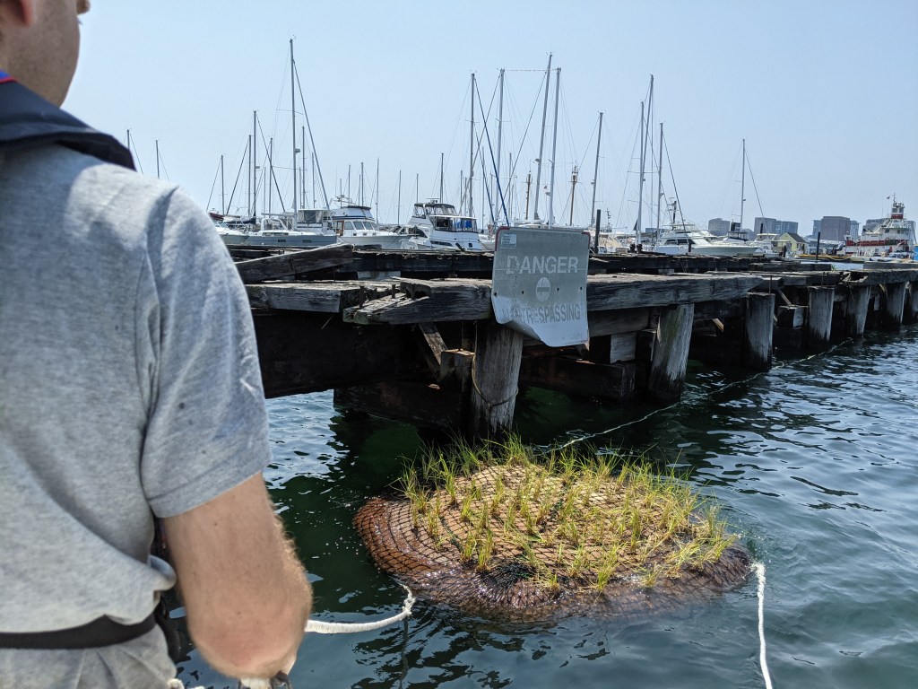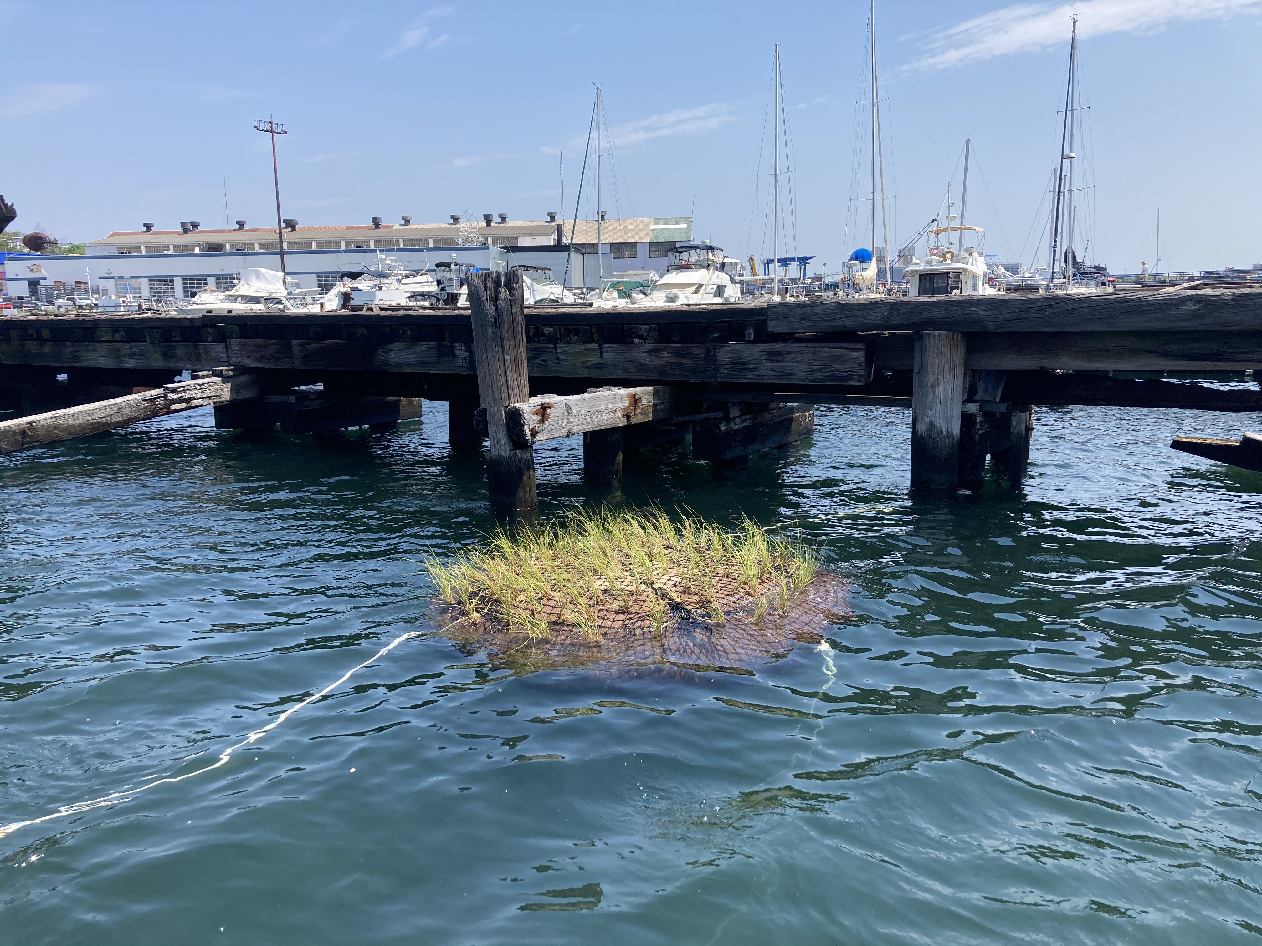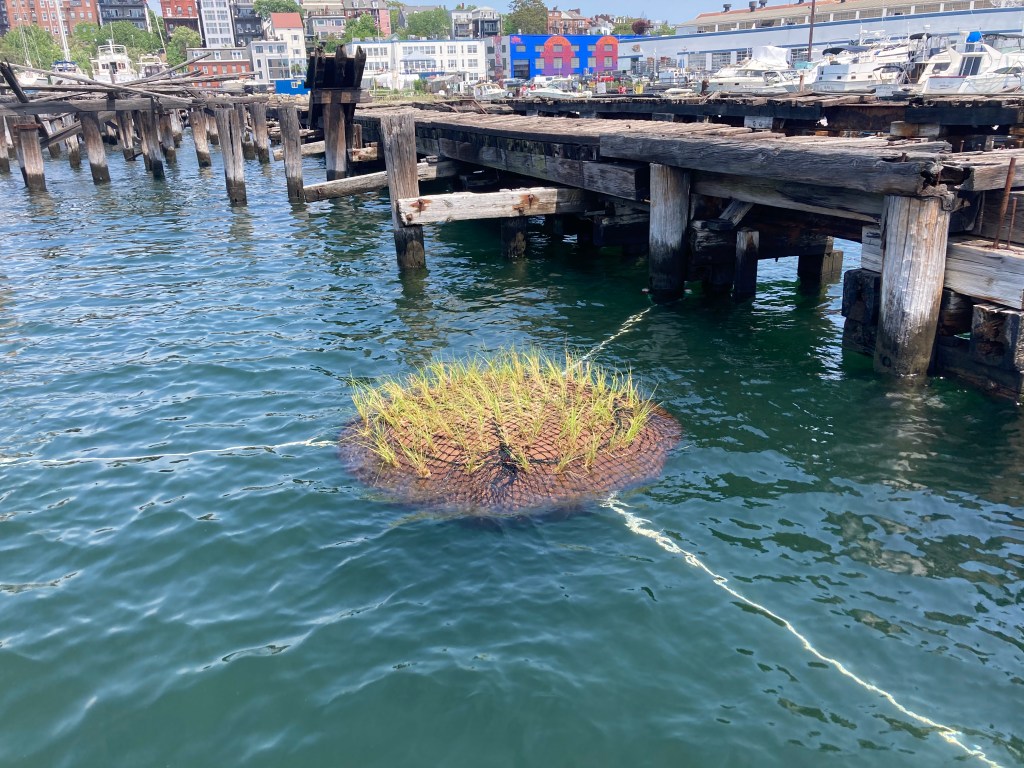 We installed our first full-scale prototype in East Boston Harbor in May 2021, leaving it in the water until the end of October. For this prototype test, we intended to assess the durability of the materials, the integrity of the unit design, and the health of the added Spartina alterniflora plants and the volunteered marine growth.