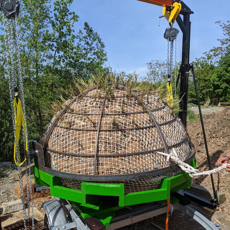 After the launch and monitoring of this unit, we designed and built an apparatus to help us prefabricate similar prototypes off-site and load them onto a trailer for launch. A suspended 5 foot diameter rounded metal “basket” provided a work area and mold form for layering biomass and other components together, and a rounded wooden cradle then received the completed prototype. Then, the cradle would be hoisted onto the rails of a boat trailer for delivery and launch. We used this system for a season before realizing that the prototype design had some fatal flaws.
