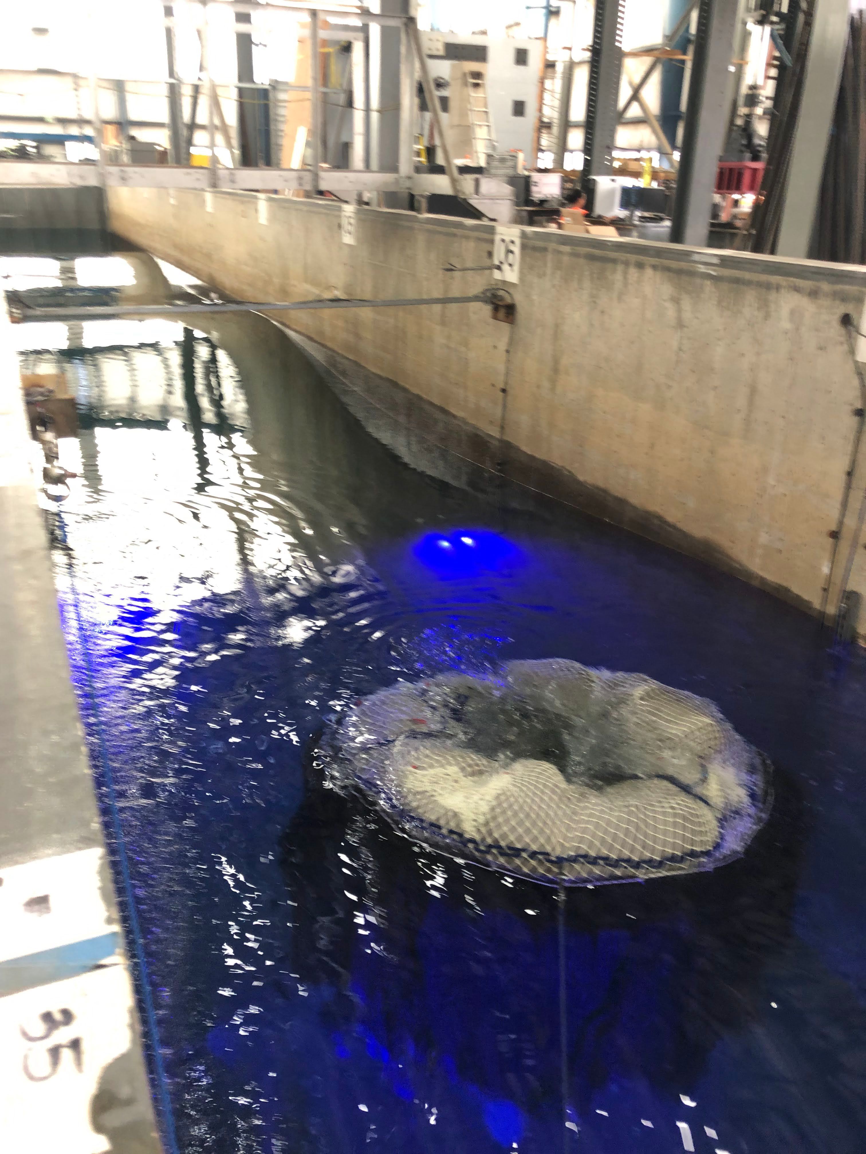 The goal was to look more closely at the micro-scale hydrodynamic effects in the immediate surroundings of a single full-scale, vegetated prototype. This time we wanted to carefully observe how much wave refraction, turbulence, and drag effects would be caused by varying densities and roughnesses of vegetation.