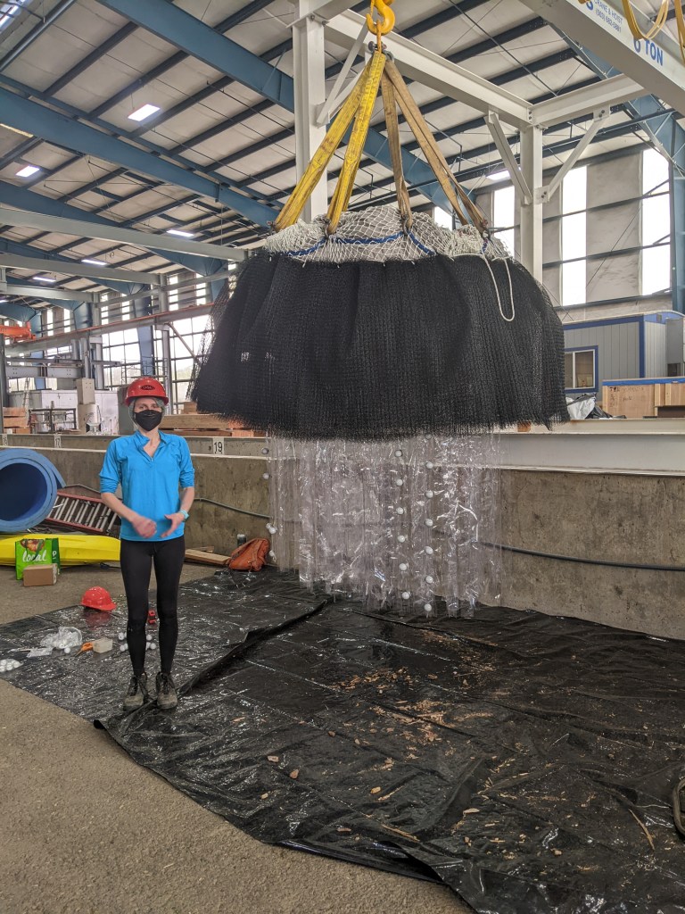 To prepare for this experiment, we built one floating prototype, most similar to the Pouch Net Prototype (variety, using canvas, foam, and wood waste. We also attached rainscreen mesh and thick flexible vinyl sheets to hang from the bottom of the prototype to mimic vegetation and seaweeds.