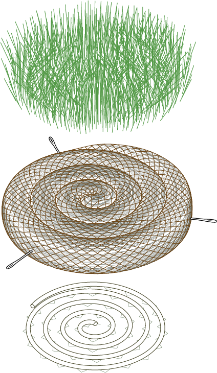As with all our prototypes, the final element is the living component, the Spartina alterniflora marsh grass. Since the spiral disc is premade, it typically has the marsh grass plants inserted just before being transported to a coastal deployment location to ensure they stay moist and survive. The various concentric spaces between the spiral wraps work well to tightly hold plant plugs as the roots grow.