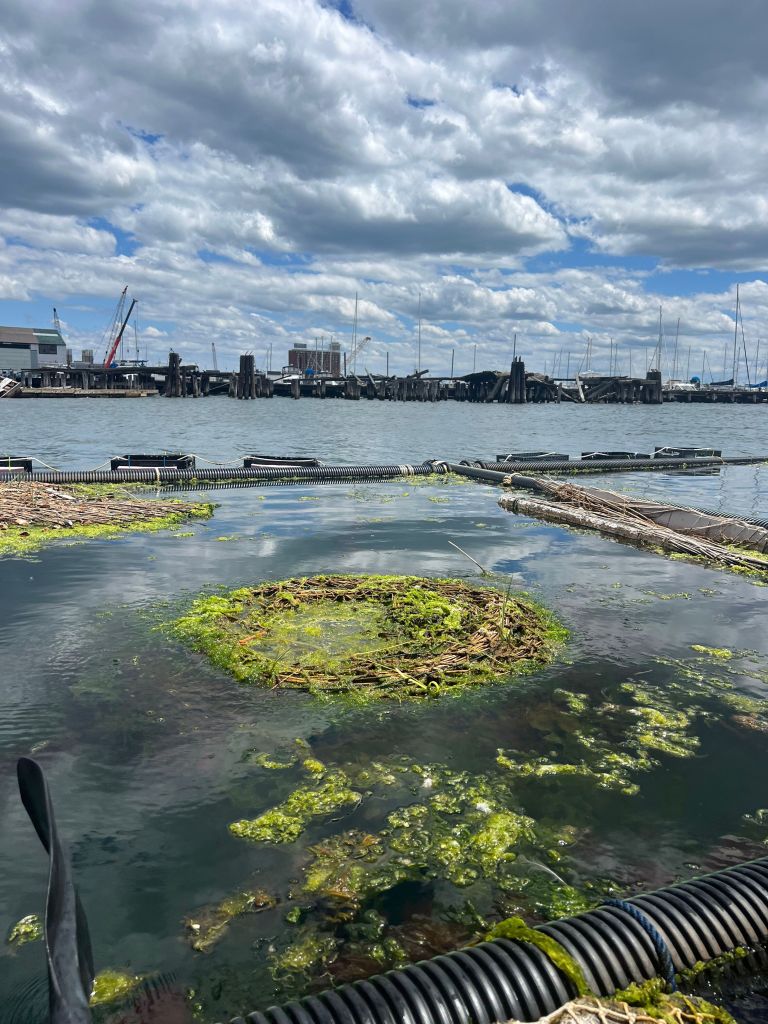 - Two prototypes with polyethylene lashed on the bottom survived the winter and in the early spring were still floating but sitting lower in the water due to (1) the foam degrading, (2) the Phragmites becoming increasingly heavier due to saturation, (3) as the weather became warmer, algae colonizing the top of the prototypes, and (4) uneven tensions from the attachment system in the Graving Dock. The spiral mats became imbalanced and lopsided due to those four compounding factors, causing the prototypes to flip over and arrange themselves with buoyancy on top and biomass towards the harbor floor.