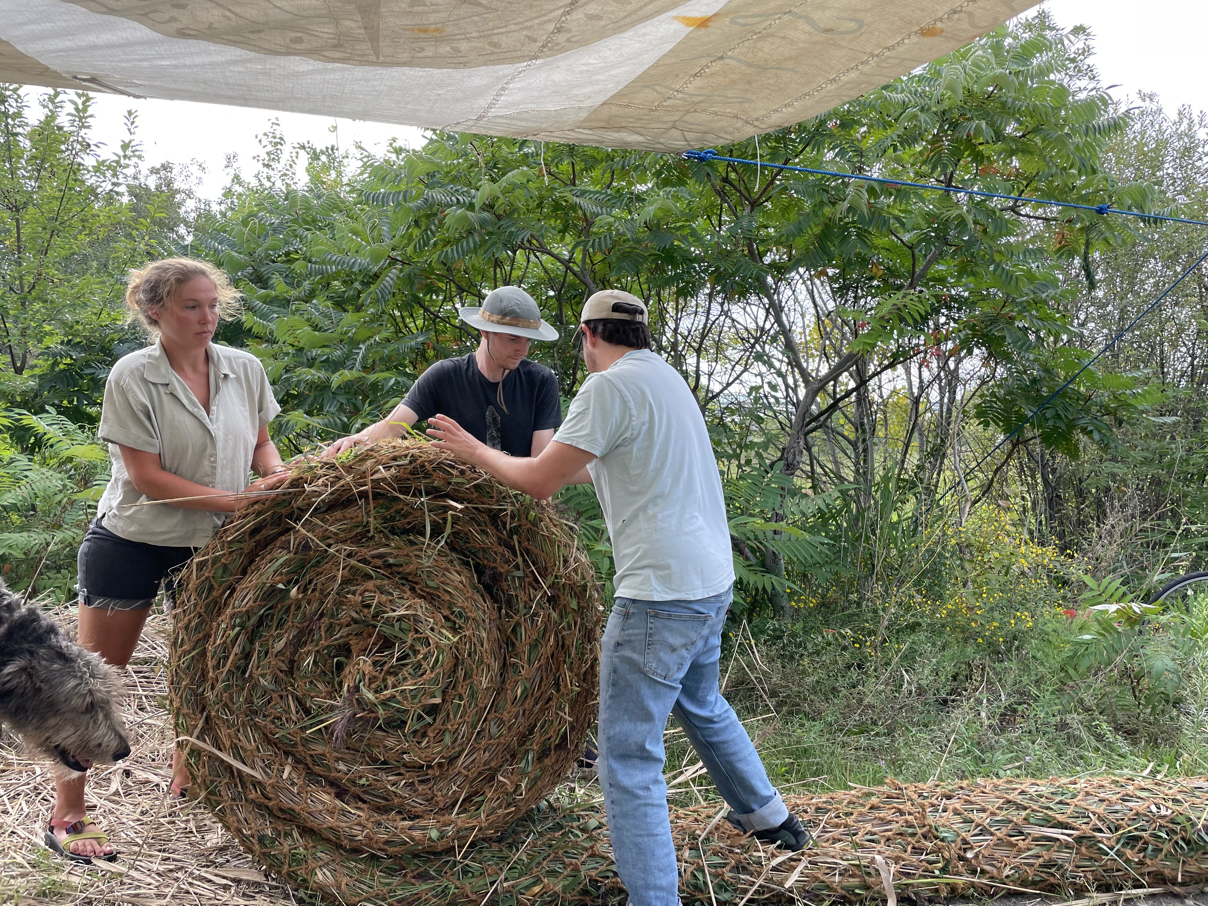 As the plastic sheeting is pulled out from one end, the coconut fiber tube tightens around the inner biomass, creating a long continuous log of Phragmites encased in coconut fiber netting.