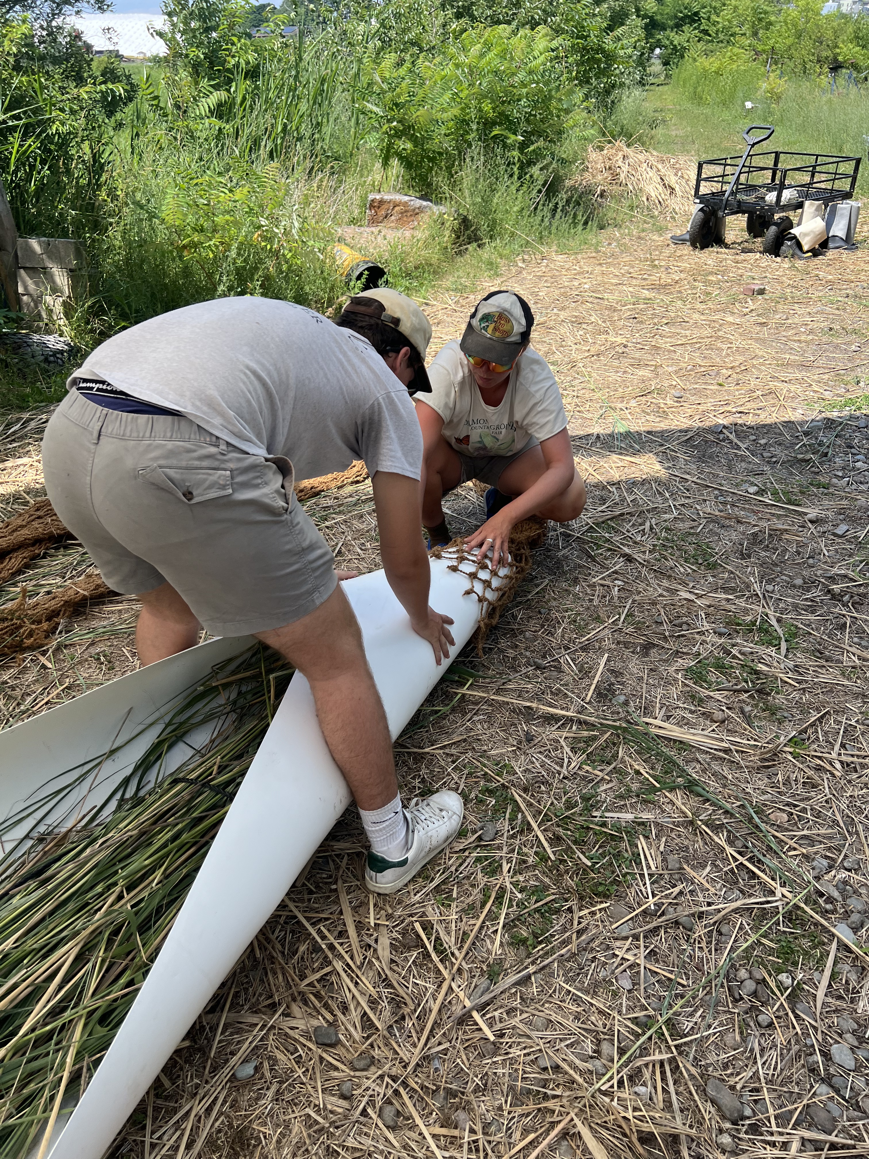 The sides of the plastic sheet are curled in to encapsulate the biomass, and a long coconut fiber tube of netting slides easily around the outside of it.