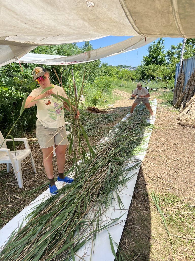 Harvested Phragmites reeds are laid atop a 40 foot long flexible sheet of plastic, taking care to spread and distribute the individual reed pieces so there is always adequate overlap in their length. This ensures a uniform diameter log of material, with no inconsistencies where kinks or tears could form.