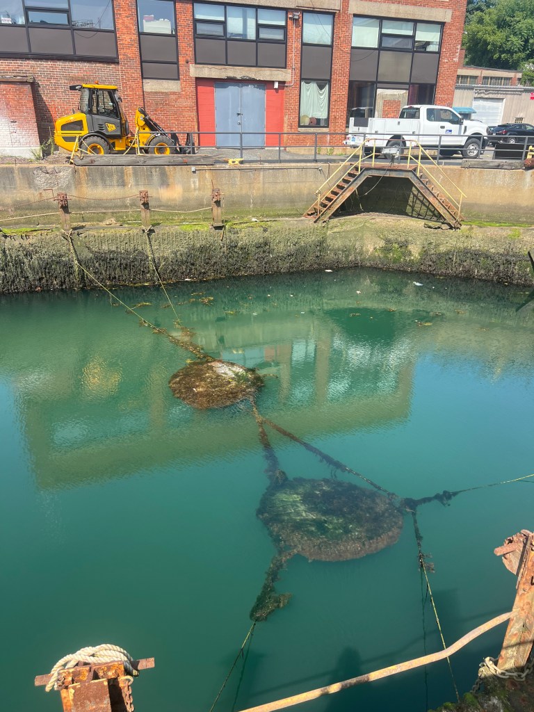 Two more prototypes were attached to each other and deployed at the East Boston Shipyard Graving Dock and secured by ropes tied to chains at the wharf edges. The chain and rope combination allowed for the units to rise and fall with the large tidal range.